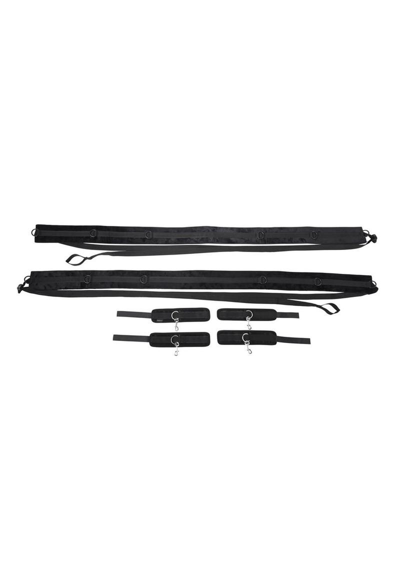 Surrender your body to entrancing restraints anywhere, anytime you want with the ultra-portable and adaptable No Matter Where Restraint System! Give your partner total control as you position yourself spread and restrained against the bed, or take your play to new heights by adjusting the straps to fit snugly against the door for standing bondage and tantalizing teasing. The possibilities are endless with the nearly 10b of adjustable straps to tether your partner to anything you can imagine for the most erotic predicaments. Four included cuffs will keep them right where you want them in any position you like with the 6 D Ring connectors per strap stretched across 5b of padded webbing.